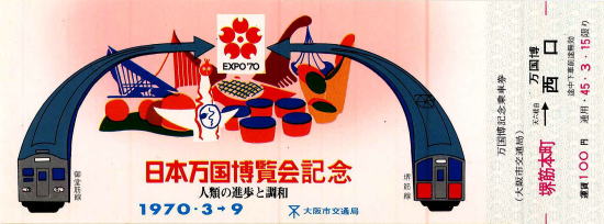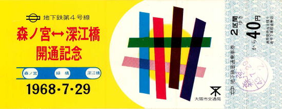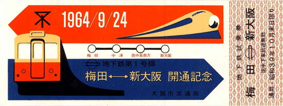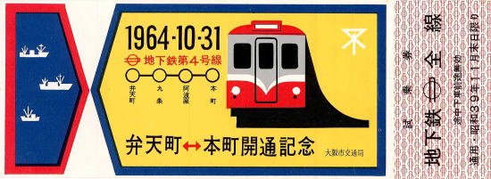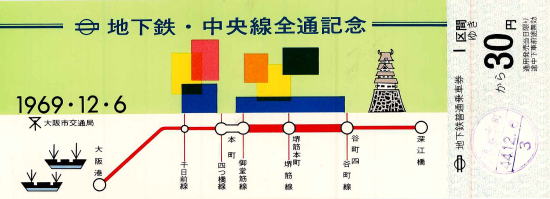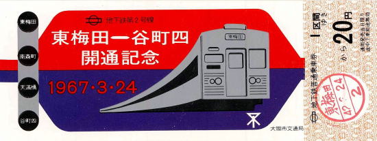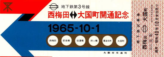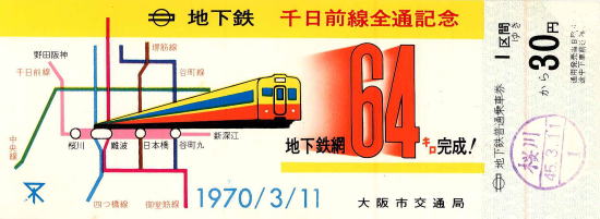 1970年/昭和45年大阪万国博のとき, 大阪市電は全廃になり, 1965年当時,27kmの地下鉄網は, 64km(6路線)に拡大しました。 現在は,130km(8路線)です。 地下鉄の開通時には, 記念乗車券が発売されました。 当時,高校生の私は, 記念乗車券を求めて,走り回りました。 |