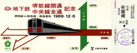 1969.12.6 堺筋線開通 (6号線) 動物園前 −天神橋筋六 中央線全通 (4号線) 本町−谷町四 |