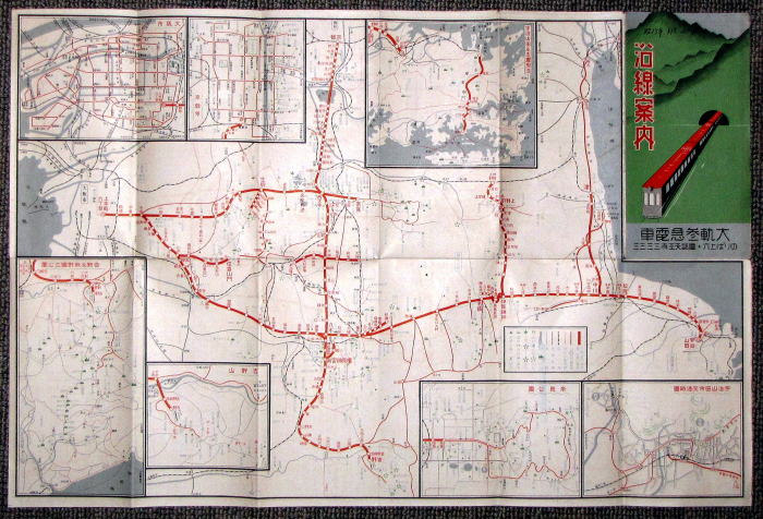 | 1938年/昭和13年発行の近畿日本鉄道の前身である大軌(大阪電気軌道)と参急(参宮急行電鉄)の沿線案内図です。 右始まりの横書きの文言に戦前を感じます。 |