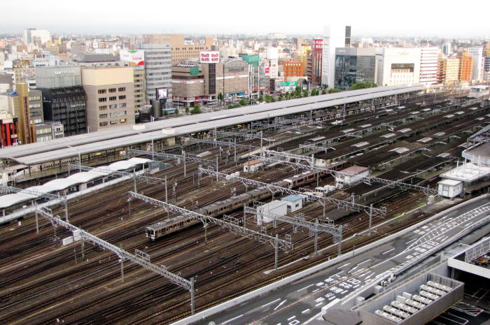 客室の前は名古屋駅の南構内です。真向かいのビルは,JR東海・太閤ビル,旧JR東海の本社ビルでした。 手前から,東海道線,中央線,関西線,新幹線のホームが並びます。多彩な列車が,頻繁に発着していました。 新幹線上りホーム14番線には,眩しい白色の新幹線列車が,発車を待っています。 ホームいっぱいの列車長(16輌編成・400m)が印象でした。 |