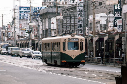 | 阪堺電車(阪堺電気軌道)は大阪に残る唯一の路面電車です。 1974年/昭和49年頃,阪堺線の電車は,緑色とクリーム色の金太郎塗色でした。 当時は,平野線(今池-平野)が運転されていましたが, 1980年/昭和55年に,大阪地下鉄・谷町線の延伸(天王寺-八尾南)開業により,平野線は廃止されました。 |