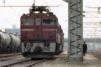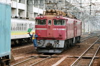 東北本線は,黒磯駅で,交直流の切替をしています。 交直切替は,駅構内の架線を区分し,地上の指示で, 架線に流す電流を切替える地上切替方式で行います。 当時,黒磯駅構内には, 交流電機関車ED75,直流機関車EF65が待機し, 旅客列車や貨物列車の機関車が交換されていました。 |