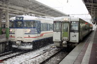 1995年1月,信越本線・新潟駅で, 降雪の中を発着する485系,115系,キハ110系を 撮影しました。 115系は新潟地区塗色でした。 当時の新潟駅は新幹線が高架,在来線が地上にあり, 在来線は信越本線,白新線,越後線が接続, 白新線には羽越本線直通特急いなほが発着しました。 |