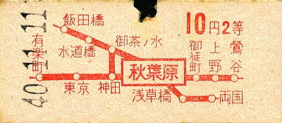 地図式乗車券 秋葉原から10円区間行き 秋葉原駅1965年/昭和40年11月11日発行 2等 10円 |