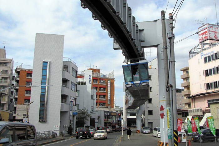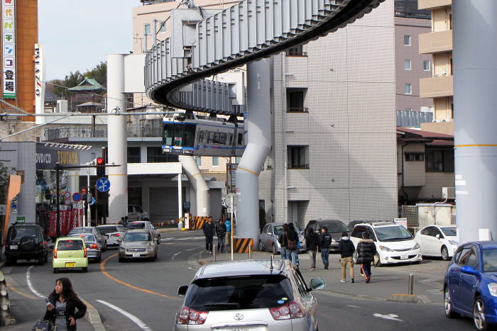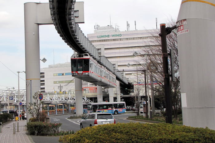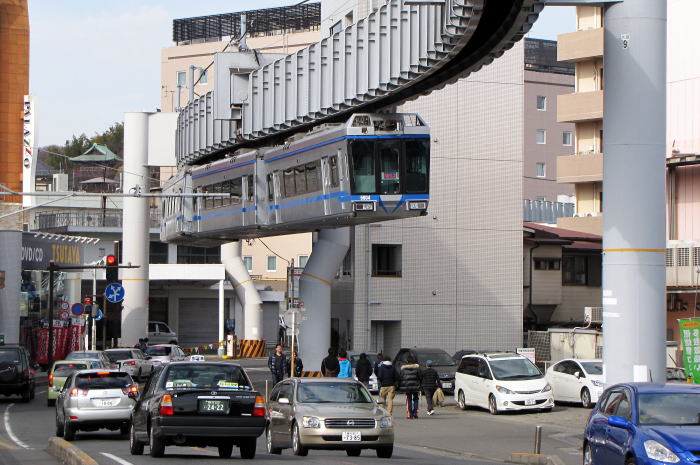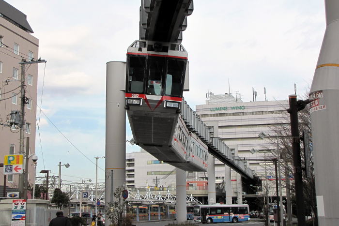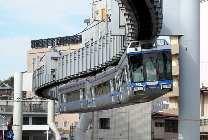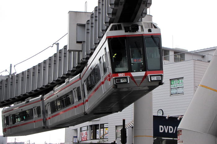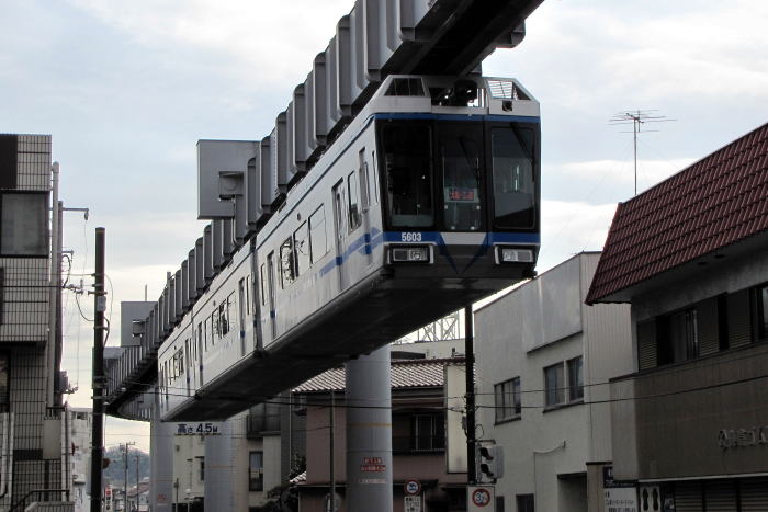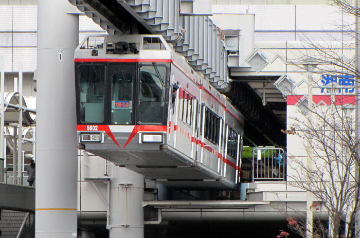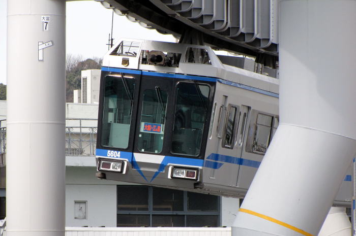 5000形は,2004年に製造されたモノレール車輛です。現在3編成が登場しています。 2004年登場の第1編成(5301-5201-5302 → 2010年変更 5601-5201-5602)に続き, 2007年に帯色を青にした愛称“湘南ブルーライン”として 第2編成(5503-5202-5504 → 2009年変更 5603-5203-5604)が登場, 2009年には,帯色が緑の“グリーンライン”第3編成(5605-5205-5606)が登場しています。 2008年に,第2編成“湘南ブルーライン”が西鎌倉駅で衝突事故を起こし, 原因究明のため2年間 運転を休止しました。 その後,改修され,2010年に復帰しています。 |