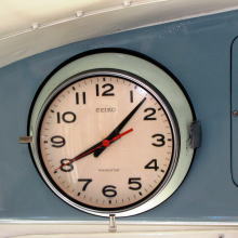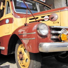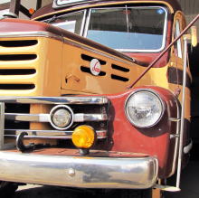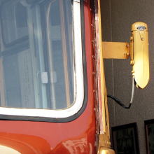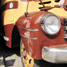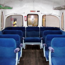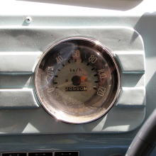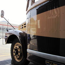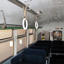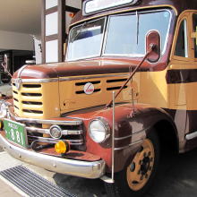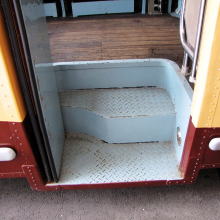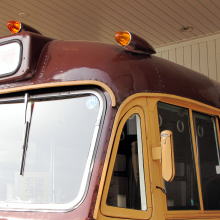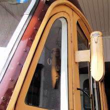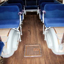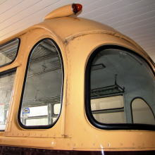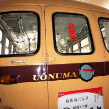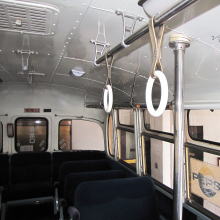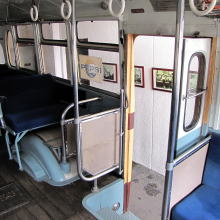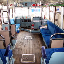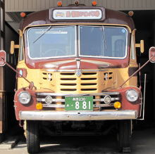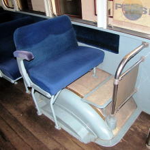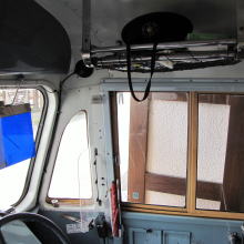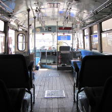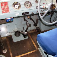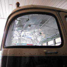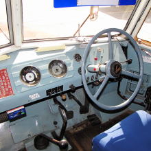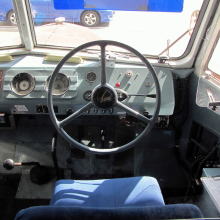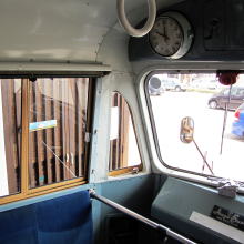 木の床にフェルトの椅子,円形メータが並ぶ運転席,温かい車内でした。
