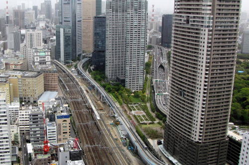 | 世界貿易センタービルの北側からは, 新橋方向にのびる東海道新幹線,東海道本線・京浜東北線・山手線,ゆりかもめが俯瞰できます。 高層ビルの谷間を走り抜ける新幹線電車を撮影することができました。 |