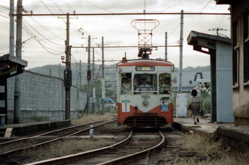 高岡駅前から六渡寺までは, 高岡軌道線, 六渡寺から越ノ潟までは, 新湊港線です。 デ7053号 1991.9.26 六渡寺 〔加越能鉄道 万葉線〕 |