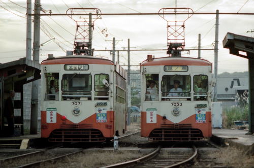 デ7070形は, 1967年/昭和42年に デ7071〜7076の6両が 製造されました。 ほぼ同じ仕様です。 デ7071号とデ7053号 1991.9.26 六渡寺 〔加越能鉄道 万葉線〕 |