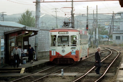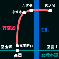 1991年/平成3年当時,勤務先の工場が,新湊(現 六渡寺)にあり, 加越能鉄道・万葉線(高岡駅前-越ノ潟 12.8km)に乗車しました。 万葉線は,正式には, 高岡軌道線(高岡駅前-六渡寺)と新湊港線(六渡寺-越ノ潟)の2路線ですが, 万葉集を編集した大伴家持が,越中国守として高岡赴任したことに因んで, 1980年/昭和55年に,“万葉線”という愛称が付けられました。 その後,加越能鉄道が,万葉線廃止の意向を示したことから, 高岡市と新湊市(現 射水市)が,第三セクタ “万葉線株式会社” を設立して, 2002年/平成14年,加越能鉄道から事業譲渡され万葉線を運営しています。 現在は,アイトラム(超低床2車体連接車)が主体に運転されています。 |