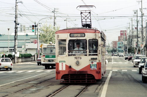 当時の万葉線には, 7000形,7060形,7070形の ほぼ同仕様の路面電車が 運用されていました。 7073号 1991.9.28 広小路 〔加越能鉄道 万葉線〕 |
