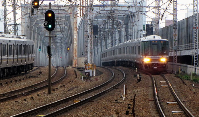 一方,大阪-塚本間の淀川鉄橋は,トラス式で,高速道路と併設されているため,撮影には向きません。