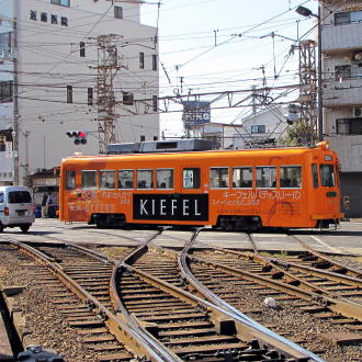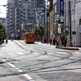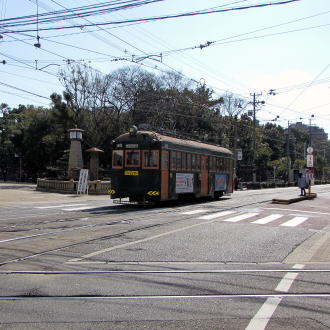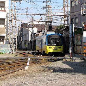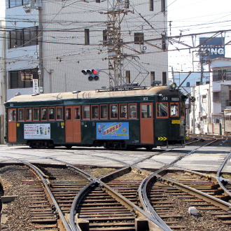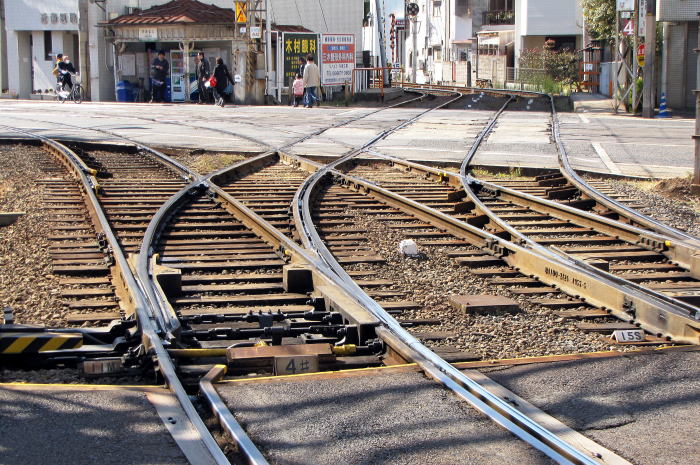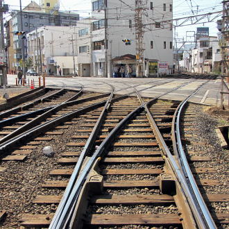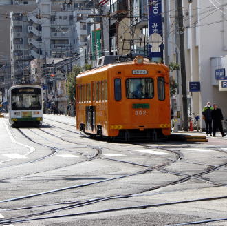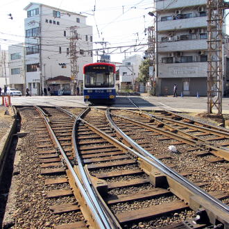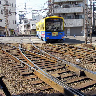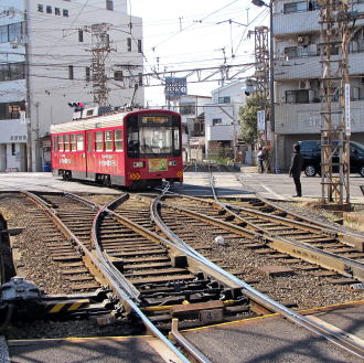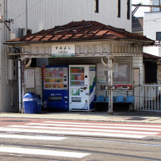 住吉駅は,阪堺線と上町線の交差駅です。 阪堺線と上町線の電車が頻繁に往来します。 住吉駅の電停は,4か所にあります。 天王寺駅前から住吉公園と浜寺駅前行の 電車が運行しています。 浜寺駅前行の電車は,住吉駅で阪堺線に乗入れます。 道路では,レールが複雑に交差しています。 恵美須町から,我孫子道行の電車に乗り, 住吉大社前の住吉で下車しました。 交差点では,スピーカーで, 電車の接近と乗り場の案内をしていました。 |