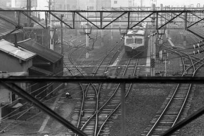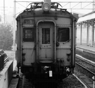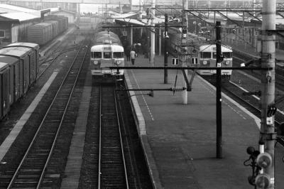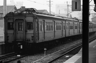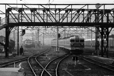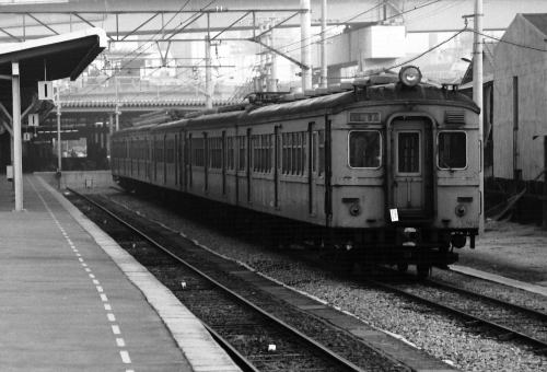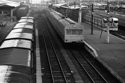 関西本線(現 大和路線)の終着駅である湊町(現 JR難波)は,1973年/昭和48年に電化しており, 撮影当時の1977年/昭和52年は,関西本線の快速(113系)と普通(101系)が運用されていました。 快速用113系電車は,明灰色に,春日大社の鳥居をイメージした朱色の帯を巻いていました。 普通用101系電車は,奈良公園の若草山をイメージしたウグイス色に塗装されていました。 湊町駅は,1996年/平成8年に,現在の地下駅に移転し,その後,JR難波に改称されています。 広く,がらんとした駅構内には,引退した阪和線の旧型国電が留置されていました。 また,駅構内の東西を結ぶ歩行者用の跨線橋や蒸気機関車の転車台など懐かしい鉄道アイテムがありました。 湊町駅は,大阪の繁華街・難波に近いのですが,当時は,ローカル線の終着駅のように人影は少なく, がらがらの電車が発着していました。 |