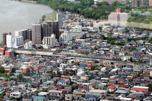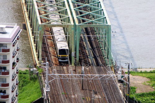 | 市川 江戸川上空 ◆ザ タワーズ・ウエストの展望デッキ(45階・地上150m)の西北方向に, 江戸川を渡るJR総武本線と京成電鉄線が望めます。 JR総武本線と京成電鉄線の江戸川鉄橋はワーレントラス橋のため, 鉄橋を走行する列車を,すっきりと俯瞰することはできませんが, ザ タワーズ・ウエストの周りに,大きな建物はなく, 鉄橋に向かう列車や離れる列車を,追いかけることができます。 赤い屋根の成田エキスプレスや総武快速のE217系電車, 総武緩行線のE231系電車が,つぎつぎにやって来ます。 JR総武本線の北を走る京成電鉄線には, ステンレス車体の3500形,3700形が走っています。 |