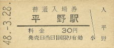 | 平野 “ひらの” 30円 〔関西本線〕 昭和48年3月28日 |