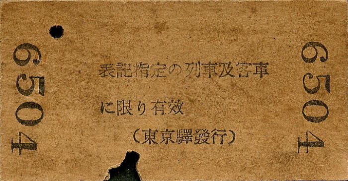 この切符は,1936年/昭和11年5月1日,東京驛発行の3等,800kmまでの特別急行券です。 翌日の5月2日,東京驛から3列車・第5号車の乗車を指定しています。 料金は2円です。 3列車の列車愛称は櫻(さくら)です。 切符の表面には櫻マークの印が押されています。 昭和11年当時,特急列車は 富士(ふじ)・櫻(さくら)・燕(つばめ)でした。 【特急列車の創始】 特別急行(特急)列車が設定される前,急行列車より速い列車に 最急行という種別をつけることがありました。 1906年/明治39年,新橋-神戸間に設定された“最急行 1・2 列車”は, 運賃以外に初めて速達サービスの料金を徴収する列車であり,現在の有料特急・急行の元祖と言われています。 特別急行(特急)の種別を初めて用いたのは,1912年/明治45年に前述の最急行 1・2 列車を区間延長して, 関釜連絡船を介して中国・欧州などへの国際連絡運輸の一翼を担う“大陸連絡列車”として 新橋-下関間で運転を開始した 1・2 列車です。 1914年/大正3年に東京駅が開業すると,1・2 列車も東京駅始発となりました。 【戦前の特急列車】 昭和に入ると特急列車に愛称が付けられました。 1929年/昭和4年 特急1・2列車に富士(ふじ),3・4列車に櫻(さくら)の愛称が付けられました。 これが日本における列車愛称の始まりです。 1930年/昭和5年には,東京- 神戸間に新しく,特急燕(つばめ)11・12列車の運転が開始されました。 燕(つばめ)は超特急と呼ばれ, 東京 - 大阪間を11時間弱で運行していた富士(ふじ)・櫻(さくら)に対し,同区間を8時間20分で結びました。 翌年,富士(ふじ)・櫻(さくら)も東京 - 大阪間を9時間前後の運行になり,約2時間短縮されました。 1937年/昭和12年,櫻(さくら),燕(つばめ)の補完として,東京-神戸間に鷗(かもめ)が運転を開始しました。 戦前の特急列車は,これら4列車が東京以西(東海道線,山陽線,鹿児島線,長崎線)に設定されましたが, 太平洋戦争の激化により,1944年/昭和19年 富士(ふじ)を最後に,特急列車は全て廃止,一旦消滅しました。 |