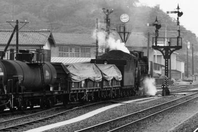 益田駅は,山陰本線(京都-幡生)の中間駅であり, 山口線(小郡:現新山口-益田)の終着駅でもあります。 山陰本線・出雲市以西では,D51,C57が遅くまで運用されました。 山陰本線・下関口の無煙化は,1975年/昭和50年でした。 益田駅で,D51 869が牽引する貨物列車が, キハ82形特急“まつかぜ”と交換して発車するシーンを撮影しました。 D51 869は,1943年/昭和18年に原ノ町機関区に新製配置されたあと, 長町,尻内,新見,浜田,長門機関区に配置転換され, 1975年/昭和50年1月24日廃車になりました。 単線の山陰本線では,列車交換のための長時間停車が多くあり, 撮影を楽しむことができました。 |