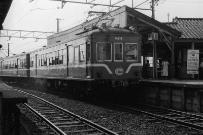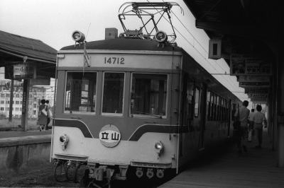 出発を待つ立山行き普通列車 富山地方鉄道の車輌形式番号は, 電動車(モハ)の場合,5桁のうち上3桁を, 電動機出力(PS馬力)で表示し, 下2桁を形式番号を表示します。 電動機のない制御車(クハ),付随車(サハ)は, 形式番号のみの2桁表示になっています。 14710形 14712 撮影 1985.8.29 電鉄富山〔富山地方鉄道〕 |