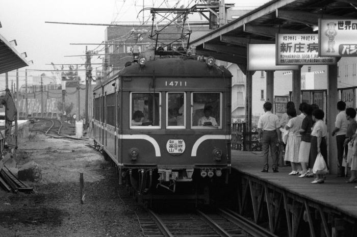 出発を待つ岩峅寺行き普通列車 1950年代の名古屋鉄道の主力電車である 名鉄3800系電車を1967年/昭和42年に 富山地方鉄道が借入れました。 1969年/昭和44年までに14輌が移籍し, 14710形として活躍しました。 14710形 11 撮影 1985.8.29 電鉄富山〔富山地方鉄道〕 |