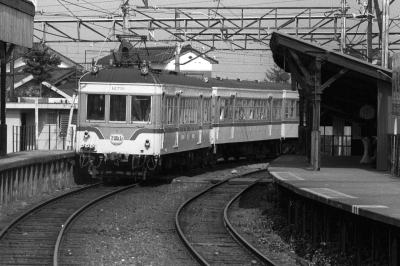 | 当時の富山地鉄には,旧型電車が多く活躍していました。 現在は,京阪3000系電車や西武5000系電車が活躍しています。 定年を迎える運転士を描いた映画 “RAILWAYS”の舞台にもなりました。 |
