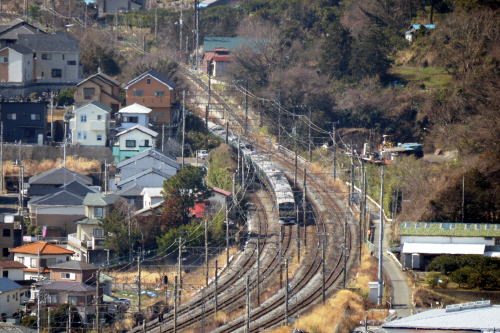 185系特急“踊り子” 2012年6月に復元された 懐かしい緑ストライプ塗装の 185系が走り抜けました。 踊り子107号 3027M 東京発・伊豆急下田行 2013.3.2 二宮-国府津 〔JR東海道本線〕 |