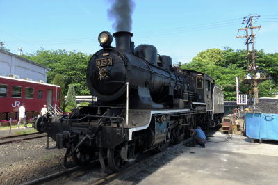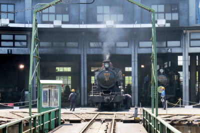 8630号機が,扇形車庫の検修線で整備されていました。 整備が終わった8630号機は,転車台で方向転換して,構内試走に向かいました。 8630号機は,1時間ほど経ってから,戻ってきました。 転車台で方向転換して,貯炭場のある引込み線に入り,石炭と水が補給されました。 再び,転車台に載り,C62 2号機の隣に留置されました。 この日の8630号機の整備は終わりました。 |