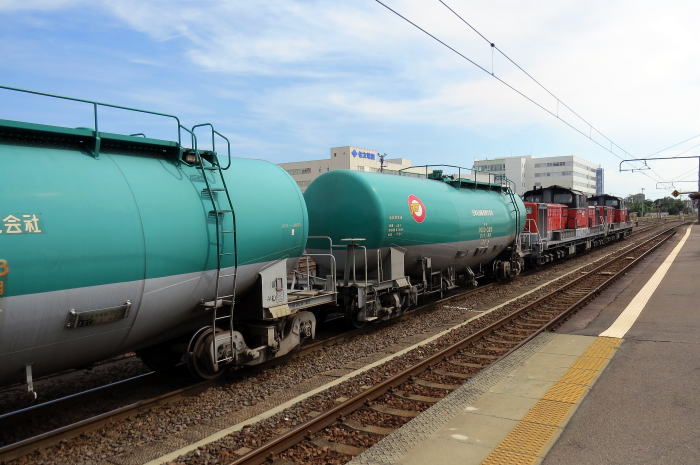 13時28分,稲沢発・DD51重連貨物列車79レが四日市に到着しました。 この貨物列車は,DD51が重連で,10輌のタキ1000形タンク車を牽引していました。 ディーゼル・サウンドを響かせて,四日市駅のホームの前を通過,停車しました。 この日のDD51は,オレンジが鮮やかなJR貨物塗色でした。 停車のあと,DD51重連は連結を解かれ,側線に走っていきました。 2013年3月以降,DD51重連貨物列車は,稲沢-四日市間に5往復運転されています。 |