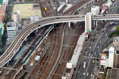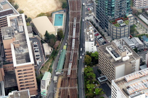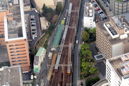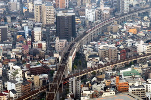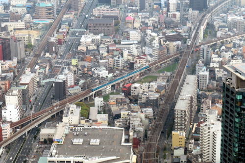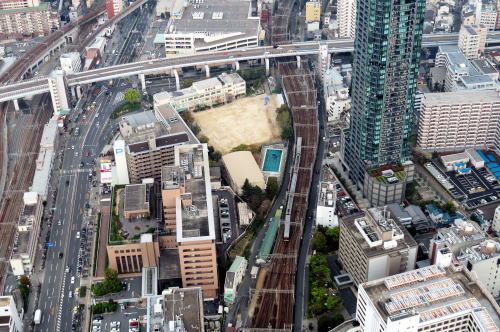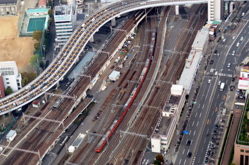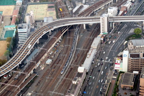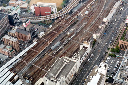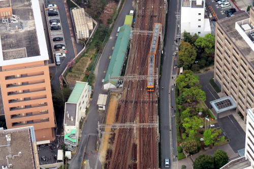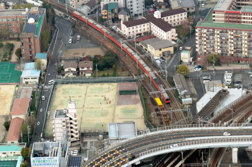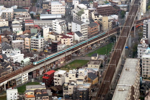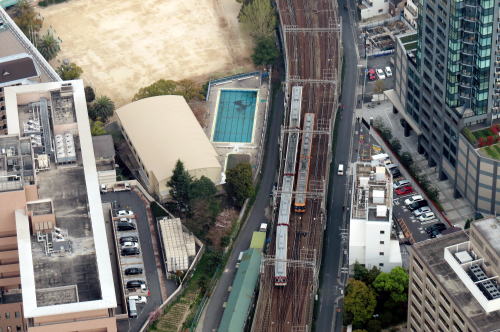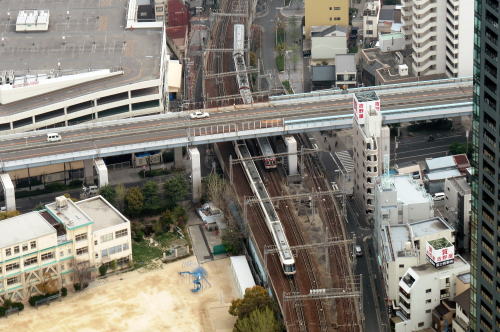 | 大阪・あべの東空散歩 ◆JR天王寺駅に隣接する近鉄・大阪阿部野橋駅に開業した 日本最高の高層ビル“あべのハルカス”の展望台“ハルカス300”から 東方向に,JR線(大阪環状線,大和路線,阪和線), 近鉄・南大阪線を走る列車を撮影しました。 JR天王寺駅には,オレンジの大阪環状線103系,201系電車, ウグイスの大和路線103系,201系電車, ブルーの阪和線103系,201系電車のほか, 221系,223系,225系の快速列車, 関空特急“はるか”,南紀特急“くろしお”など 多彩な列車がつぎつぎに発着します。 また,近鉄・阿部野橋駅に発着する電車は, 遠く河堀口駅付近から真下の大阪阿部野橋駅構内まで, 追うことができます。 |