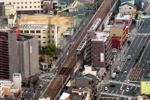 近鉄・通勤型電車 ハルカス300からは, 近鉄南大阪線とJR阪和線の 交差付近の河堀口駅が, 良く見えます。 2014.4.10 河堀口-北田辺 〔近畿日本鉄道 南大阪線〕 |
