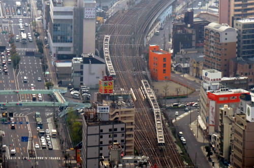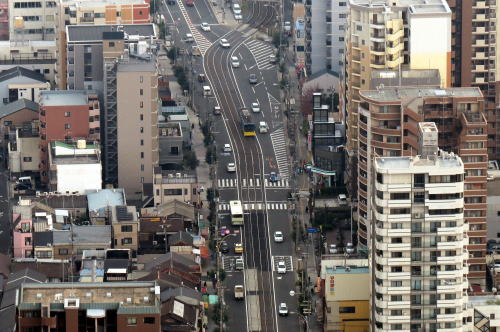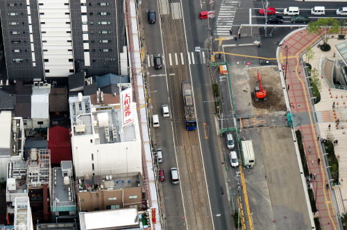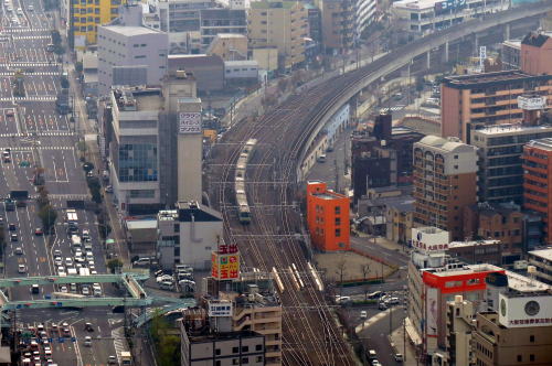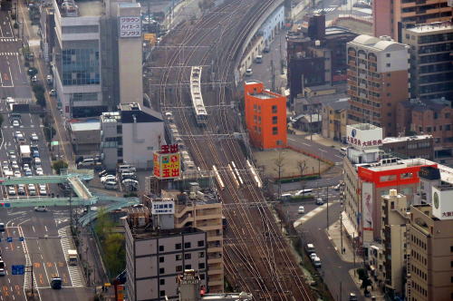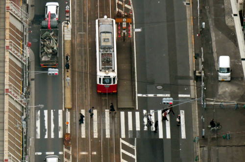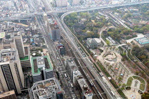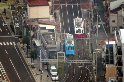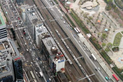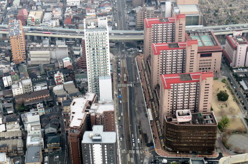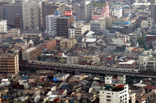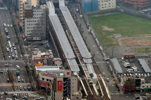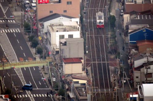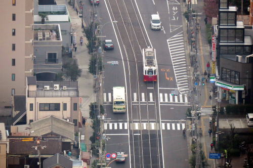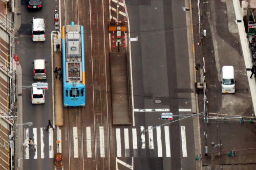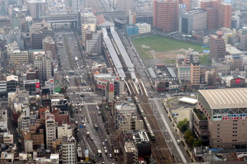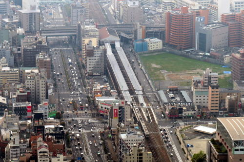 | 大阪・あべの西/南空散歩 ◆JR天王寺駅に隣接する近鉄・大阪阿部野橋駅に開業した 日本最高の高層ビル“あべのハルカス”の展望台“ハルカス300”から 西方向に,JR大阪環状線,大和路線の新今宮駅を発着する列車と, 南海電鉄・南海本線を走る列車を撮影しました。 南方向には,阪堺電軌・上町線を走る路面電車を撮影しました。 この日の撮影は15時頃のため, 新今宮を発着する電車の屋根は,太陽に照らされて輝いていました。 阪堺電車は,松虫から阿倍野,天王寺駅前まで, 併用軌道をゆっくりと進みます。 交差点の信号を待ちながら進む路面電車の往来を撮影しました。 |