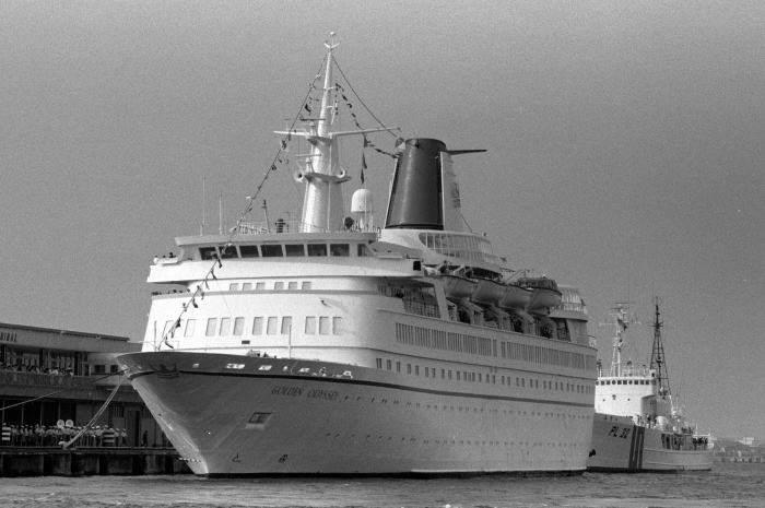 6757G.T./130m/1974年建造 船籍港 PIRAEUS〔GREECE〕 Royal Cruise Line ギリシャ客船GOLDEN ODYSSEYは,1974年/昭和49年にデンマークで建造されました。 1986年/昭和61年5月23日,横浜大桟橋に初来航しました。 1994年/平成6年に,ピースボートとして東京から世界一周をしました。 現在は,香港のカジノ・クルーズ客船 MACAU SUCCESSとして運航されています。 |