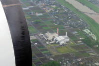 熊本地震発生の10日後の4月27日, 羽田発・熊本行 JAL625便に搭乗しました。 熊本空港に向けての降下の途中, 高い煙突のごみ焼却施設が見えました。 空港に近い熊本市中央区,東区では, ブルーシートで覆った屋根が数多く見えました。 |