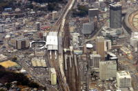 羽田825発・熊本1020着,ANA641便の座席11Aから 熊本駅・熊本城を撮影しました。 熊本に近づき着陸態勢に入りました。 高度が下がり,熊本市街が眼下に広がりました。 新幹線の高架線路を目安に熊本駅を見つけました。 しばらくして,熊本城が見えました。 |