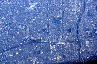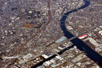 羽田1215発・熊本行 ANA3713便から, 横浜・鶴見付近を撮影しました。 羽田を離陸,西に高度が上がる途中, 京浜運河,鶴見川が見えました。 鶴見線・高速横羽線を目印に 鶴見駅,総持寺などを俯瞰できました。 |