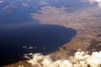 羽田1300発・熊本1455着,JAL631便から, 琵琶湖東岸(米原・沖島)を撮影しました。 羽田から厚い雲の上を飛行していましたが, 晴れ間から,琵琶湖が見えました。 米原にあるフジテックのエレベータ研究塔を発見, 沖島から大津,琵琶湖大橋を望むことができました。 |