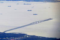 羽田から熊本への往復便から, 東京湾アクアラインを撮影しました。 羽田空港を離陸して,高度を上げる途中に 海ほたるに続く東京湾アクアラインが見えました。 帰り便では,夕陽に輝く富士山と 東京湾に延びるアクアラインが見えました。 |