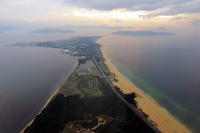 羽田1415発・福岡行 JAL323便から, 玄界灘 海の中道・志賀島を撮影しました。 福岡空港に向けて降下の途中, 古代日本における大陸交易の要所であった志賀島と 全長8kmの巨大な陸繋砂州 海の中道が見えました。 この砂州の北を玄界灘,南を博多湾と呼んでいます。 |