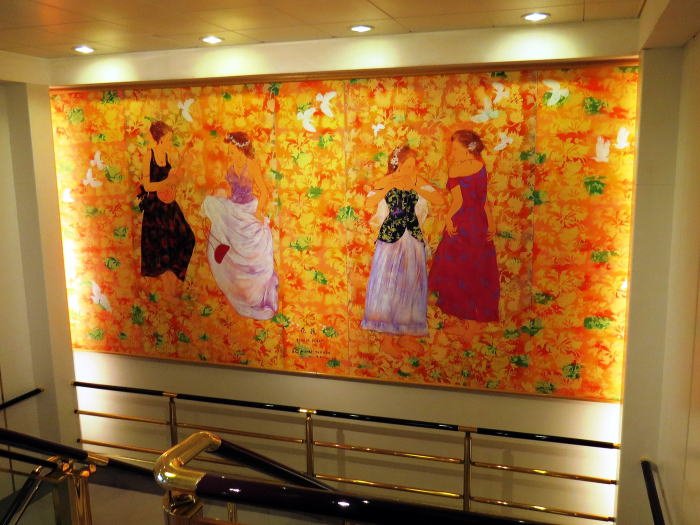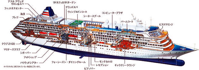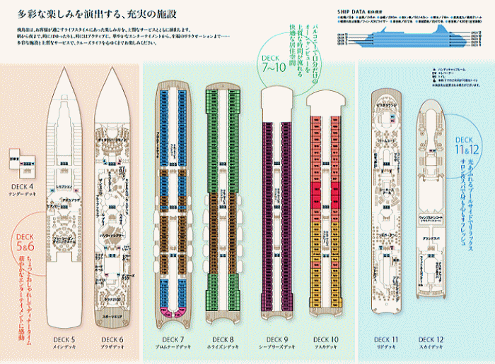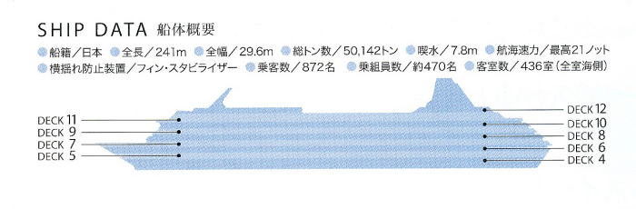 飛鳥Uの乗客用サービスデッキは,5〜12デッキの8層です。 客室は436室あります。 872名の乗客を,約470名の乗組員が対応します。 乗組員の多くは外国人ですが,日本語が通用します。 8層構造,全長241mの船内を物珍しく歩き回りました。 各デッキには,レストラン,カフェ,ラウンジ,バーが多数配置されています。 滞在が短く,全てを見ることはできませんでしたが,雰囲気を楽しみました。 とくに,プロムナードデッキは爽快でした。 |