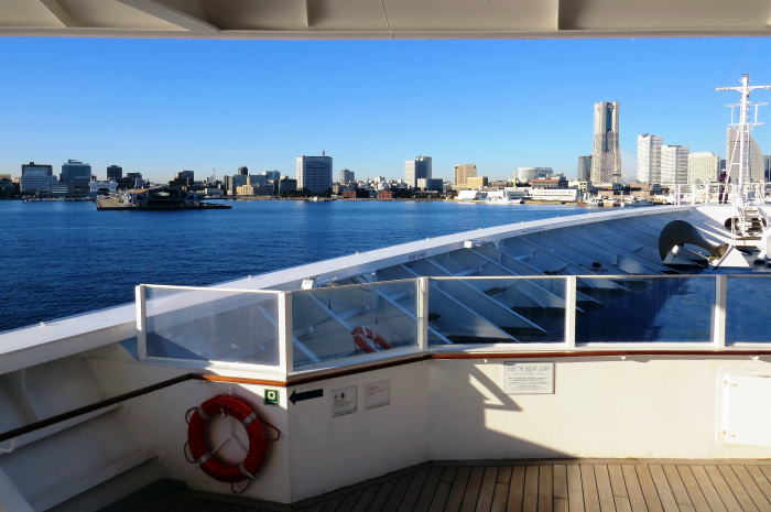 | ●船首のプロムナードデッキから大桟橋を展望(7デッキ) |