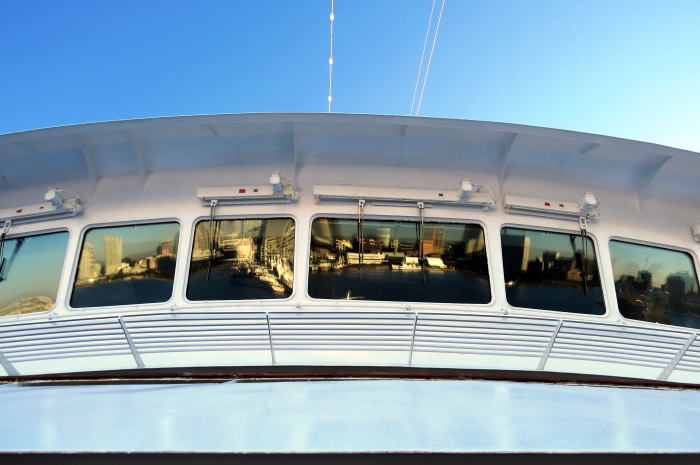 | ●8デッキから操舵室を見る,窓に映るみなとみらい(10デッキ) |