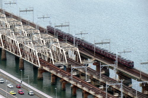 淀川を渡る阪神電車 淀川橋梁を渡る 阪神9300系6輌編成。 阪神9300系 2015.2.6 淀川-姫島 〔阪神電鉄 阪神本線〕 |