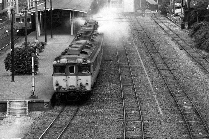 撮影/1979.7.28 鳥羽〔参宮線〕 煙を上げて発車する58系