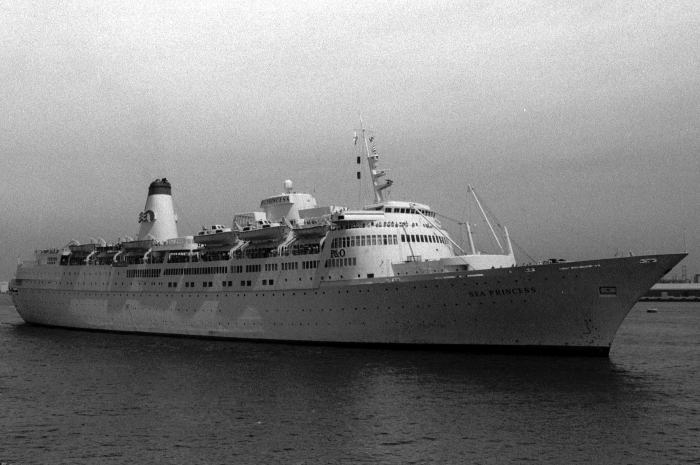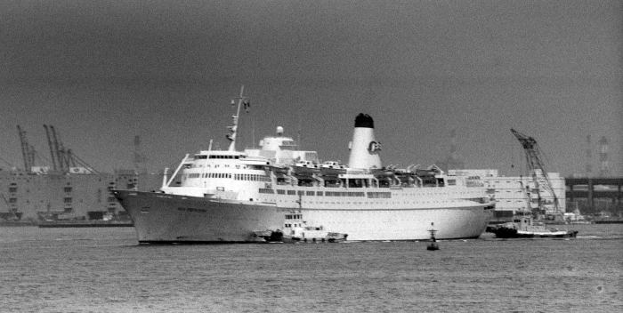 27670G.T./201m/1966年建造 船籍港 LONDON〔U.K.〕 Princess Cruises 1988年/昭和63年5月6日,横浜大桟橋に来航した英国客船 SEA PRINCESSを紹介します。 SEA PRINCESSは,当時,プリンセスクルーズの5姉妹船の中で, ROYAL PRINCESSに次ぐ豪華客船でした。 SEA PRINCESSは,1966年/昭和41年建造のスウェーデン客船“KUNGSHOLM クングスホルム”が前身であり, 1975年/昭和50年,フラッグシップクルージズに売却されたのち, 1978年/昭和53年,P&Oに売却,2本煙突を1本にするなどの大改造を受け,SEA PRINCESSに改名されました。 横浜には,1967年/昭和42年の初来航以来,たびたび来航しました。 |