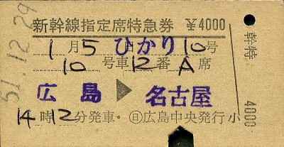 ひかり10号 新幹線指定席特急券 1977年/昭和52年1月5日 広島1412乗車・名古屋下車 10号車・12番 (日)広島中央 昭和51年12月29日発行 4000円 |