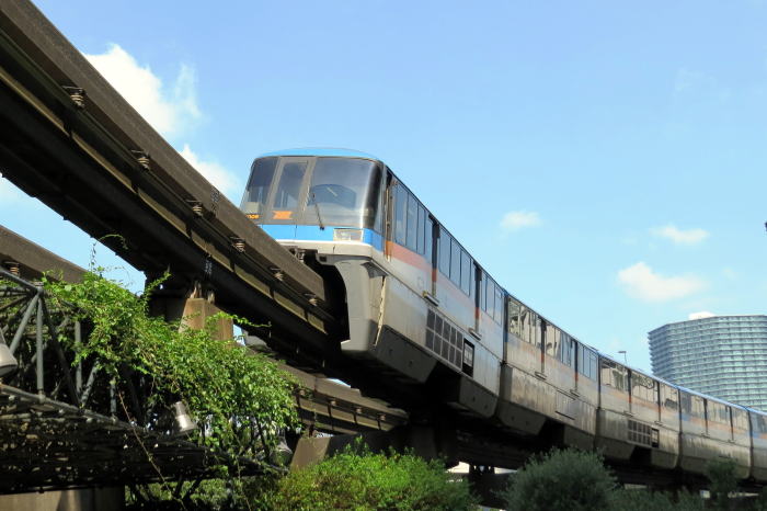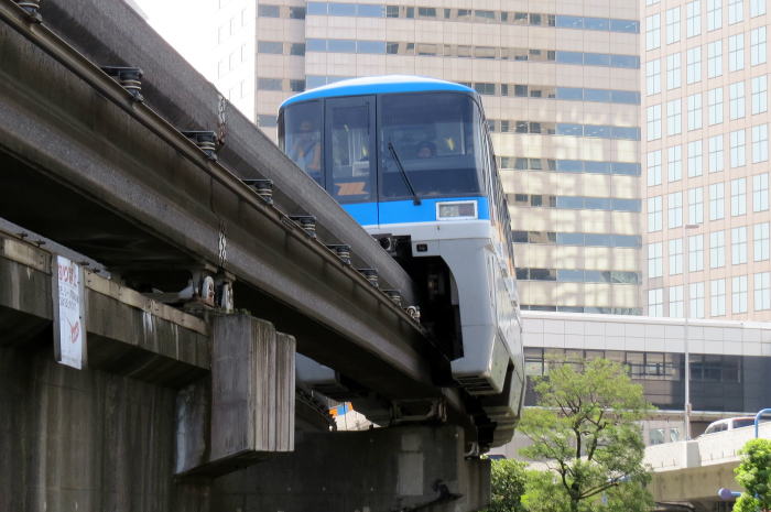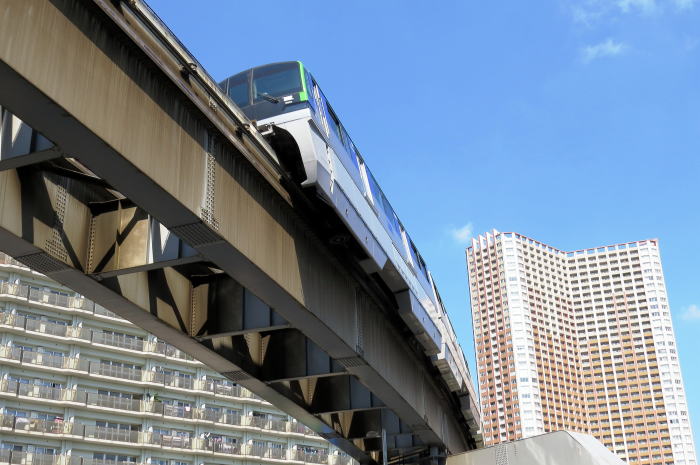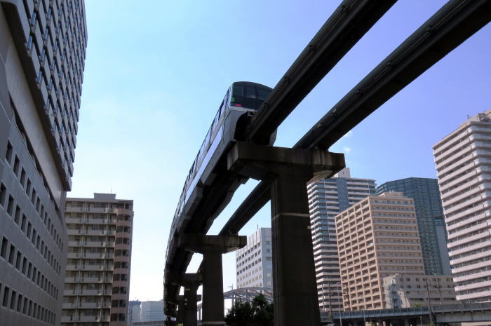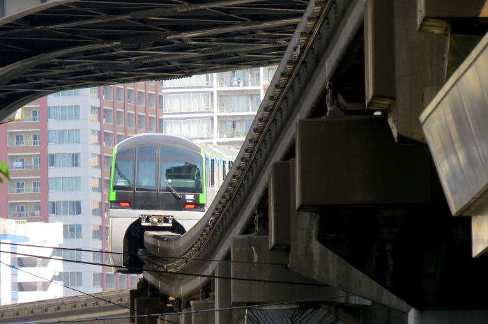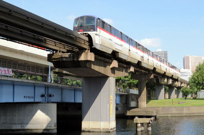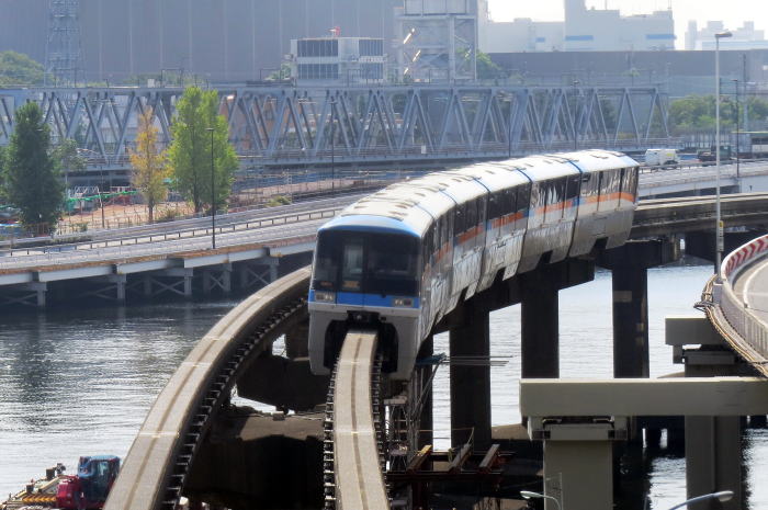 天王洲アイル駅のホームから,運河の上を走行する列車を撮影しました。 駅を降りて浜松町方向に歩くと, マンション群の中や新幹線回送線と交差して走行する列車を撮影できました。 |