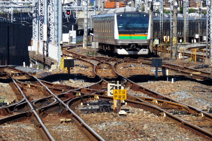 JR大宮駅・構内の北方向(宇都宮・高崎方向)に,ダブル・スリップポイントがあります。 このポイントは,大宮駅6番線,7番線に繋がっています。 6番線→ 高崎線上り,湘南新宿ライン・上野東京ライン 7番線→ 高崎線・上り/下り,湘南新宿ライン・上野東京ライン ダブルスリップポイントを231系,233系電車が頻繁に通過します。 また,EH200牽引の貨物列車も通過していきました。 |