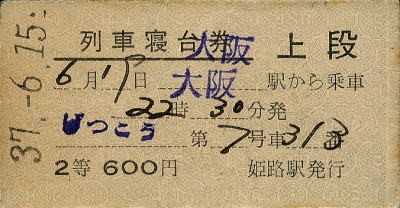 急行“月光” 列車寝台券 列車寝台券 上段 昭和37年6月19日 大阪駅から乗車 22時30分発 第7号車 313番 2等 600円 昭和34年8月18日 姫路駅発行 |