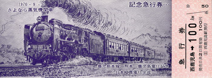| ◆さよなら蒸気機関車 熊本-鹿児島電化記念急行券 1970年/昭和45年9月30日発行 | ||