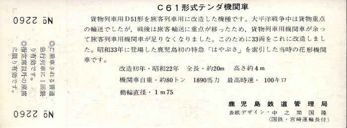 1970年/昭和45年9月30日,鹿児島本線 熊本-鹿児島電化による蒸気機関車の廃止を記念して, 西鹿児島駅発行の記念急行券です。 C61が牽引する客車列車が描かれています。 C61は1947〜49年/昭和22〜24年に, 貨物列車用D51のボイラを流用して製造された急行旅客列車用の蒸気機関車です。 33輌が製造され,東北本線,常磐線,奥羽本線,鹿児島本線に配置されました。 1968年9月30日に熊本-川尻,1970年9月1日に川尻-鹿児島が電化され,鹿児島本線全線が電化されました。 1970年9月30日にC6133牽引さよなら列車が運転され,鹿児島本線の蒸気機関車運用が廃止になりました。 |